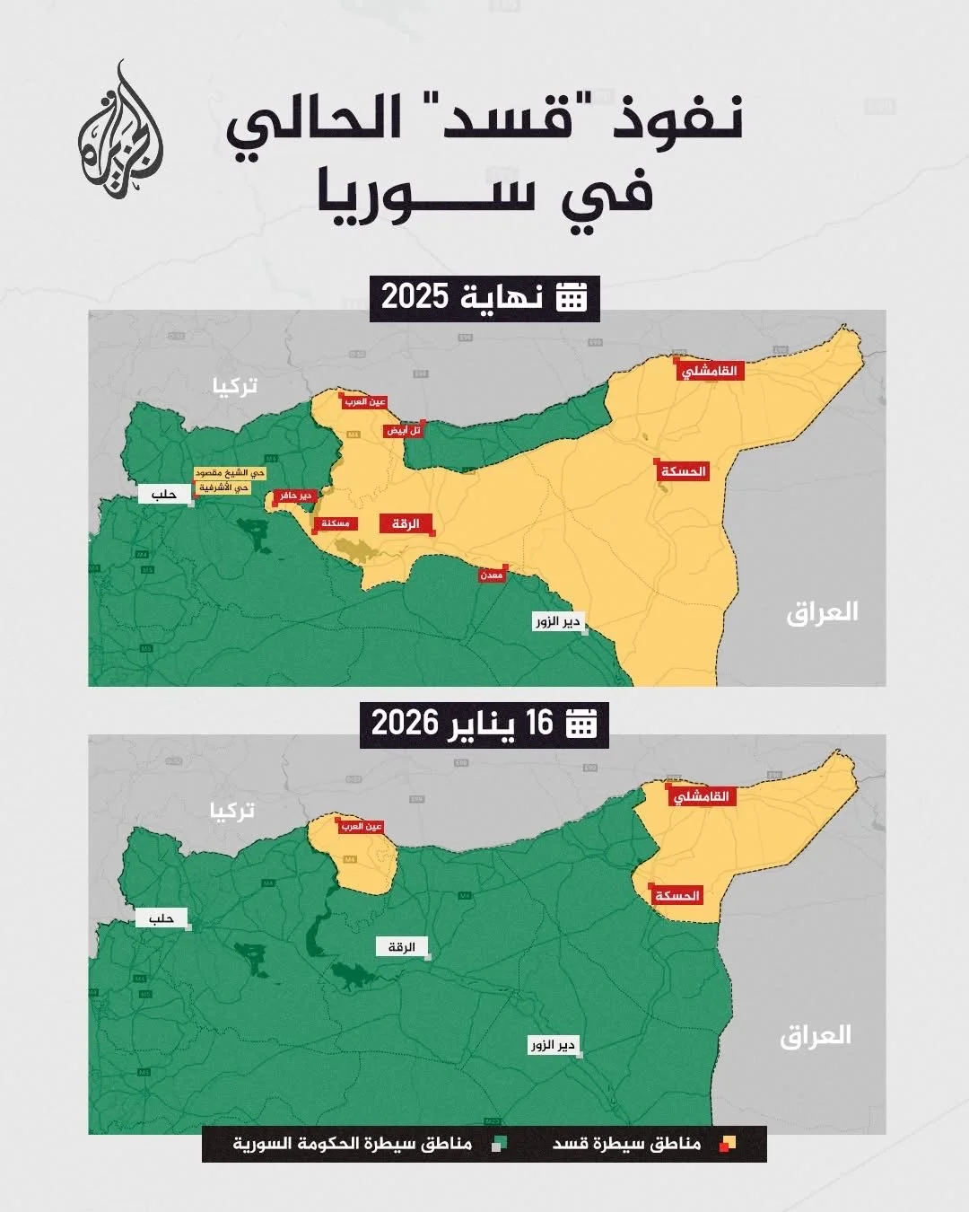 A map shows territory taken by the Syrian Army (End of 2025 -> 16 January 2026).